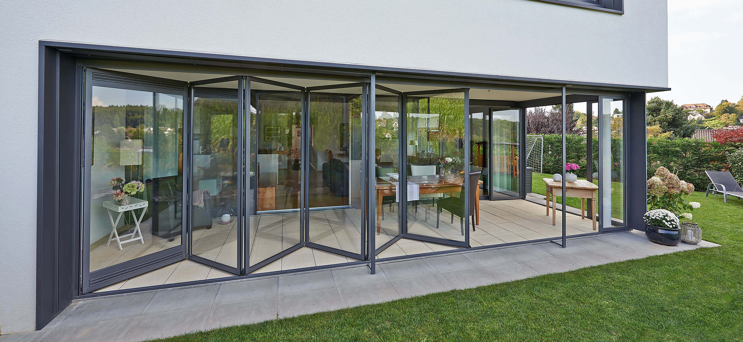 Je nach Anforderung kann auch der Einsatz einer ungedämmten Glas-Faltwand sinnvoll sein, beispielsweise als Balkonverglasung auf einer ungedämmten Fassade, als Verglasung unter einem Terrassendach oder überall dort, wo Wärmedämmung keine zentrale Rolle spielt, zum Beispiel als Raumteiler. Modernste Technik sorgt für maximalen Bedienkomfort. Durch einfaches Herausziehen der Scharnierstifte ist ein bequemes Reinigen der Außenscheiben von innen möglich. Verdeckt liegende Laufwagen aus hochwertigen Materialien garantieren ein leichtes, geräuscharmes Gleiten der Glas-Faltwand, die eingelassene Bodenschiene sorgt für barrierefreies Wohnen. Schmale Flügelprofile sorgen für eine elegante Optik, großzügige Glaselemente erzeugen maximale Transparenz.