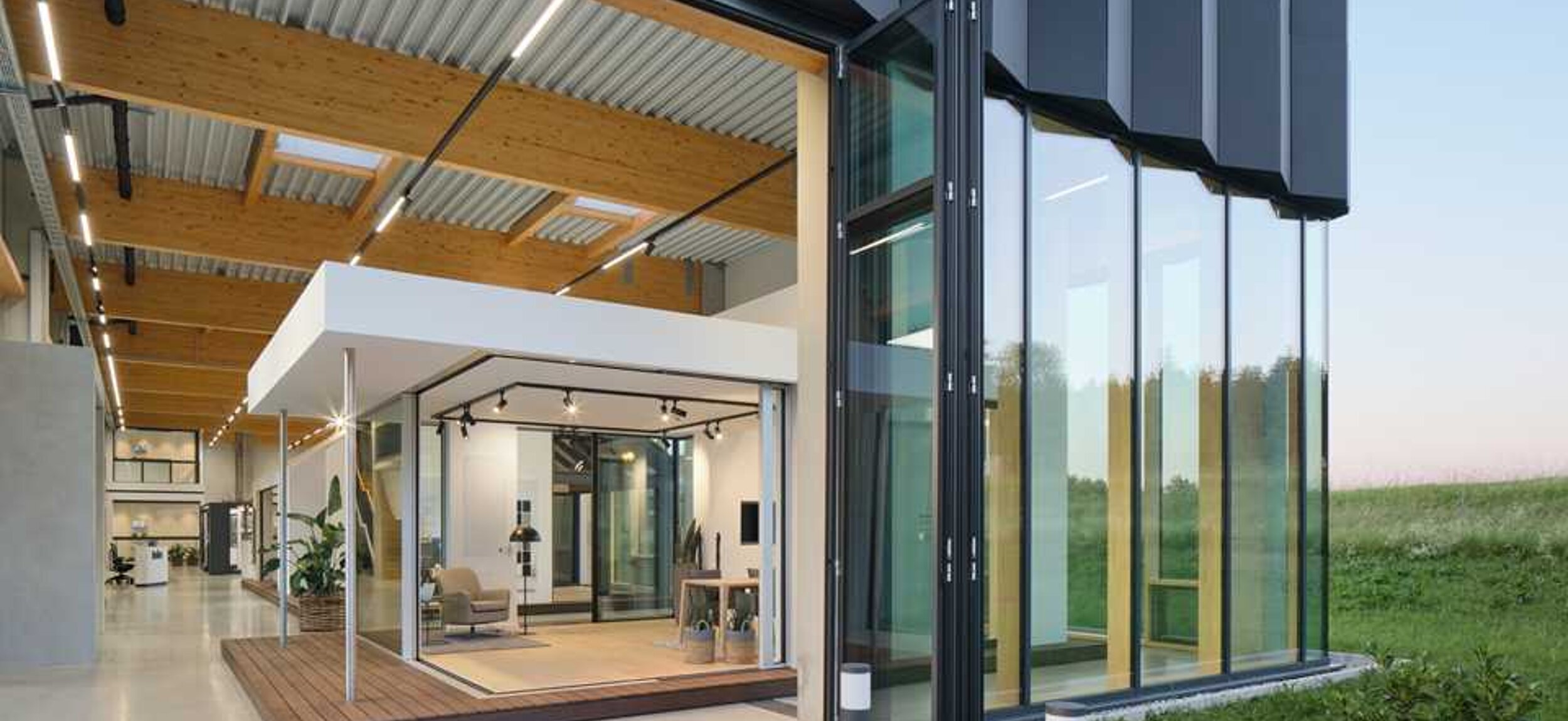 Die Glas-Faltwand SL 97 ist als unten aufstehendes oder oben anhängendes System erhältlich. Eine sehr hohe Wärmedämmung ist Kennzeichen der Glas-Faltwand SL 97 aus Holz/Aluminium. Lamellierte Holzprofile mit 96 mm Bautiefe, eine zusätzliche Dämmebene und Dreifachverglasung erzielen einen U-Wert von 0,80 W/m²K und ermöglichen eine Anlehnung an den Passivhaus-Standard. Verschiedene Öffnungsvarianten sind möglich. Die Abdichtung gegen Regen und Wind erfolgt durch drei Dichtebenen. Die Aluminium-Deckschalen an der Außenseite schützen die Holzprofile vor der Witterung.