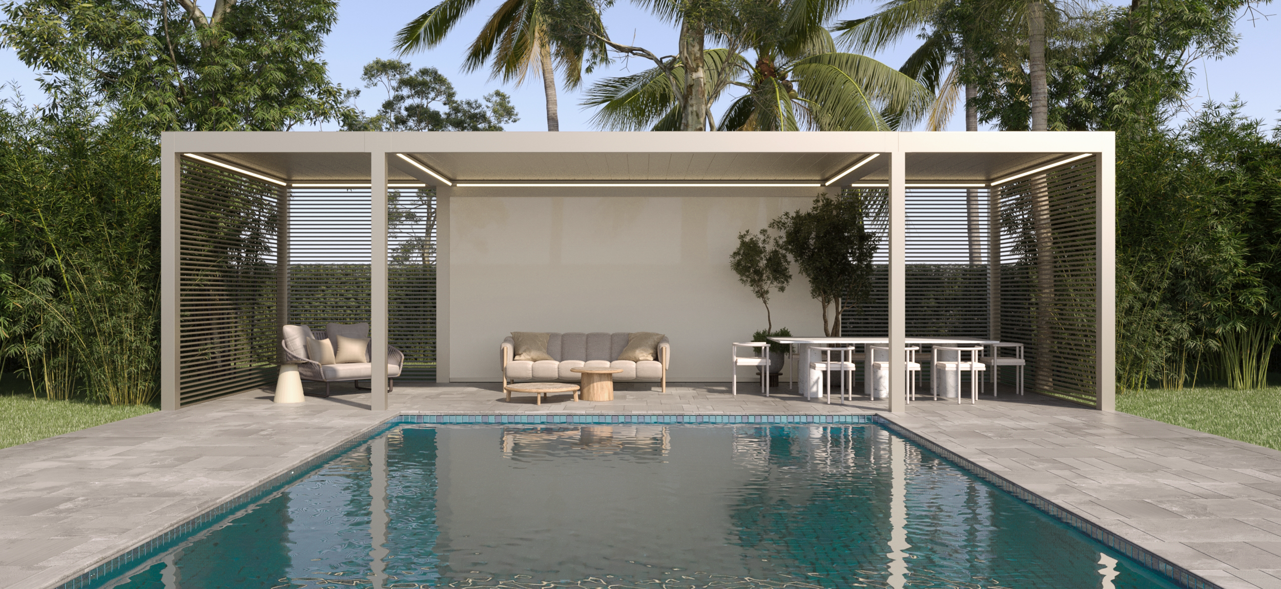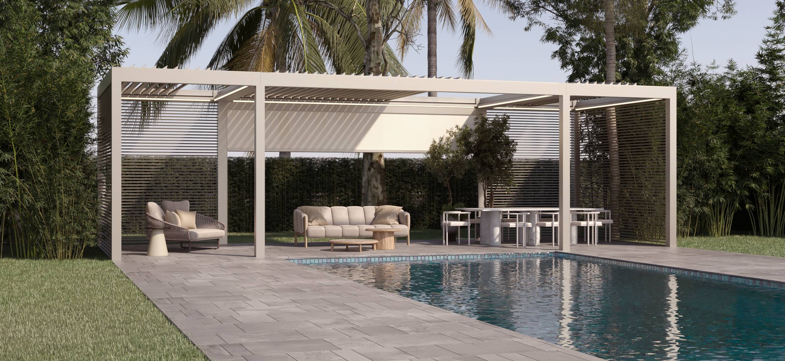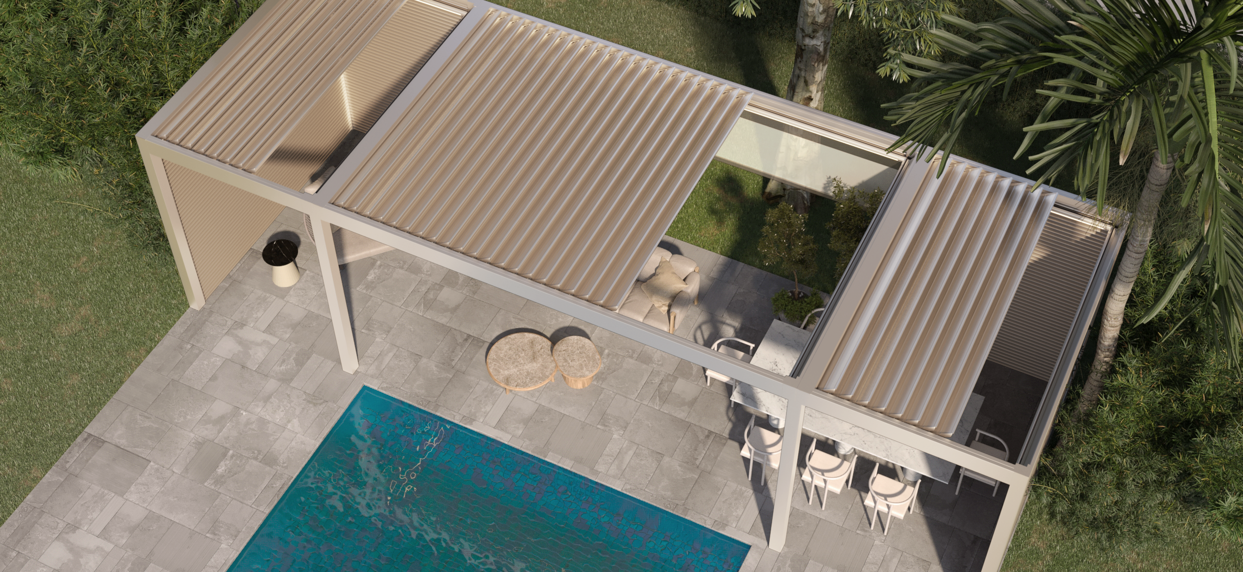 Modulares Pergolasystem aus Aluminium mit einziehbaren Lamellen und integriertem Dachrinnensystem.