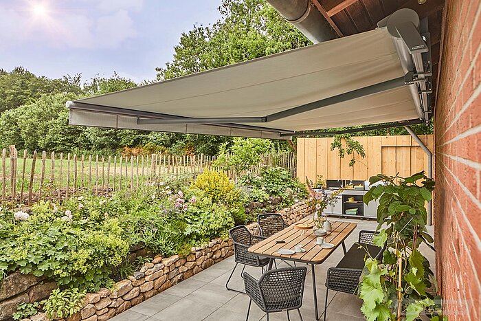 Gelenkarmmarkisen sind vielseitige Alleskönner. Als offene Gelenkarmmarkise eignen sie sich für die Montage in witterungsgeschützten Bereichen. Als halbgeschlossene Variante verfügen diese Markisen über ein Regendach, das Tuch und Gelenkarme schützt.