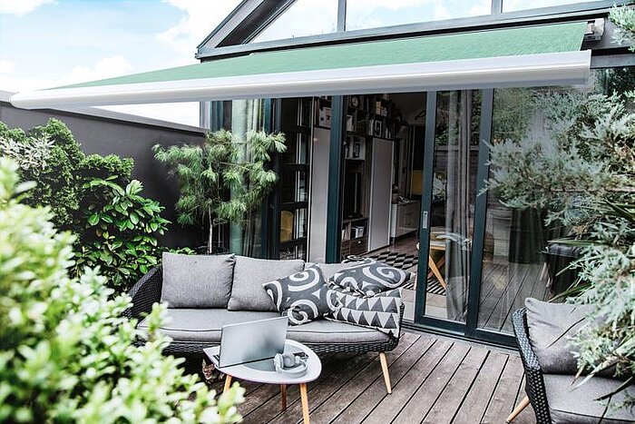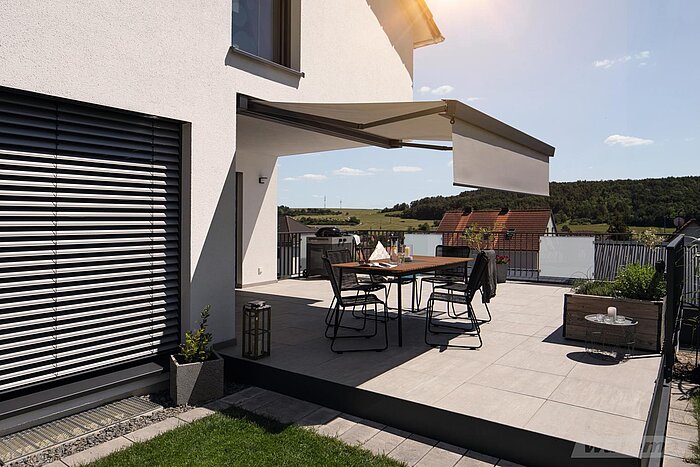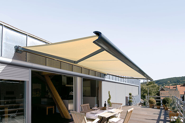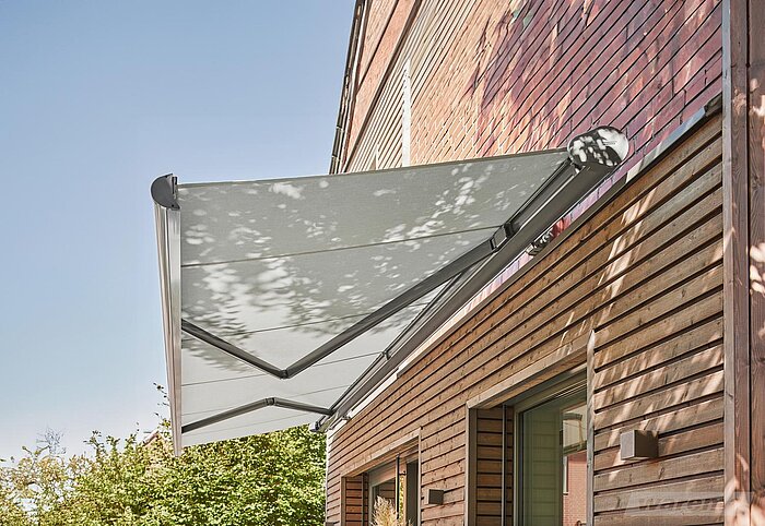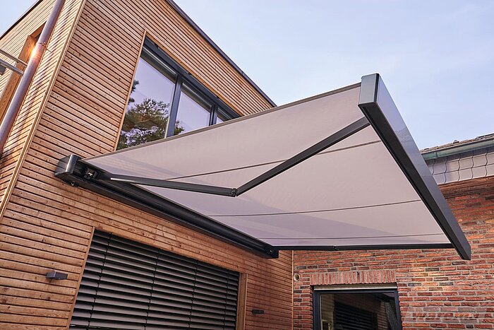 Diese Markise punktet durch ihre kompakten Abmessungen, wobei das Markisentuch im eingefahrenen Zustand vollständig in der Kassette verschwindet – geschützt vor jedem Wetter. Dabei überzeugen Kassettenmarkisen nicht nur durch ihr prämiertes Design, sondern auch durch sorgfältig konzipierte Details.