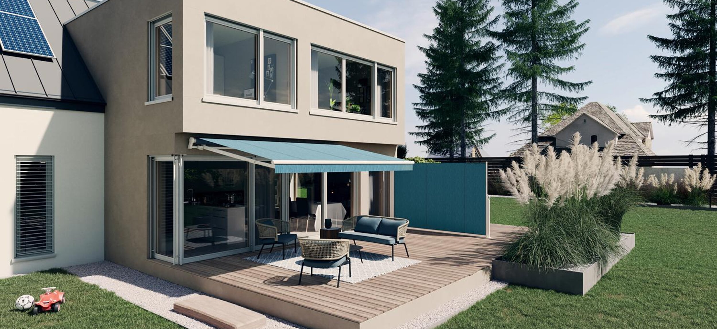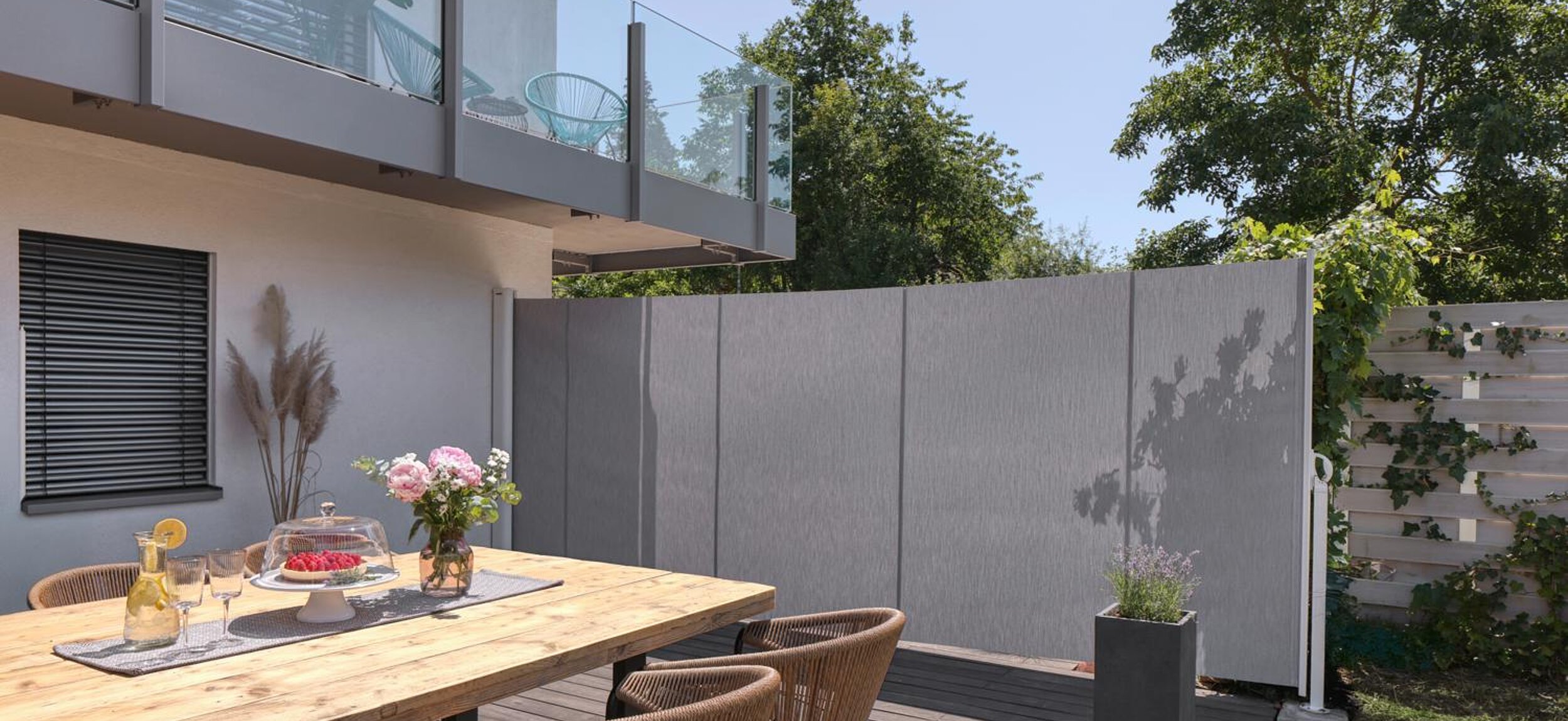 Gönnen Sie sich ein Maximum an Schutz: Vor tiefstehender Sonne, neugierigen Blicken oder einem lauen Sommerlüftchen. Unsere Seiten-Markise ist mit nur einem Handgriff kinderleicht herausziehbar.