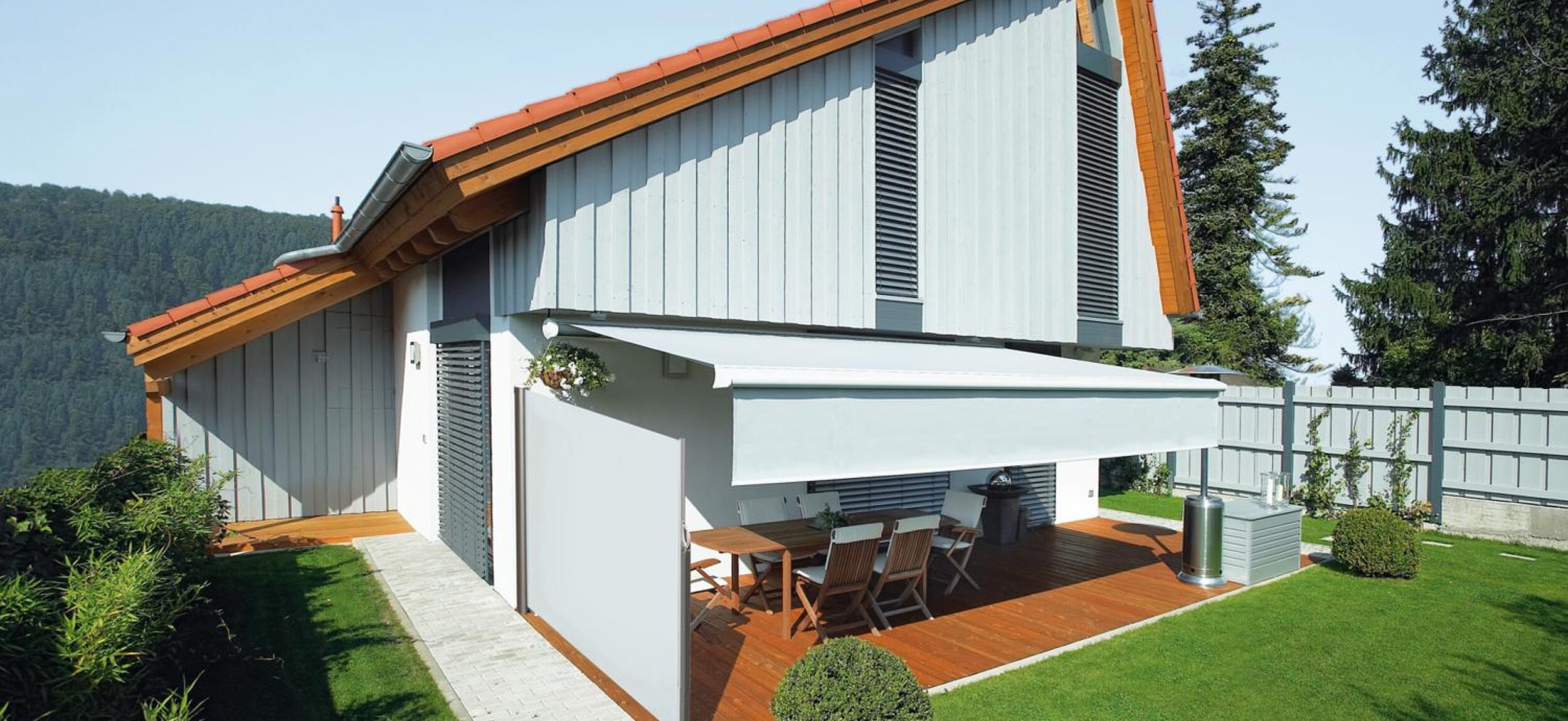 - Schräger Tuchverlauf passt sich optimal an Terrassen-Markise, Pergola-Markise oder Terrassendach an