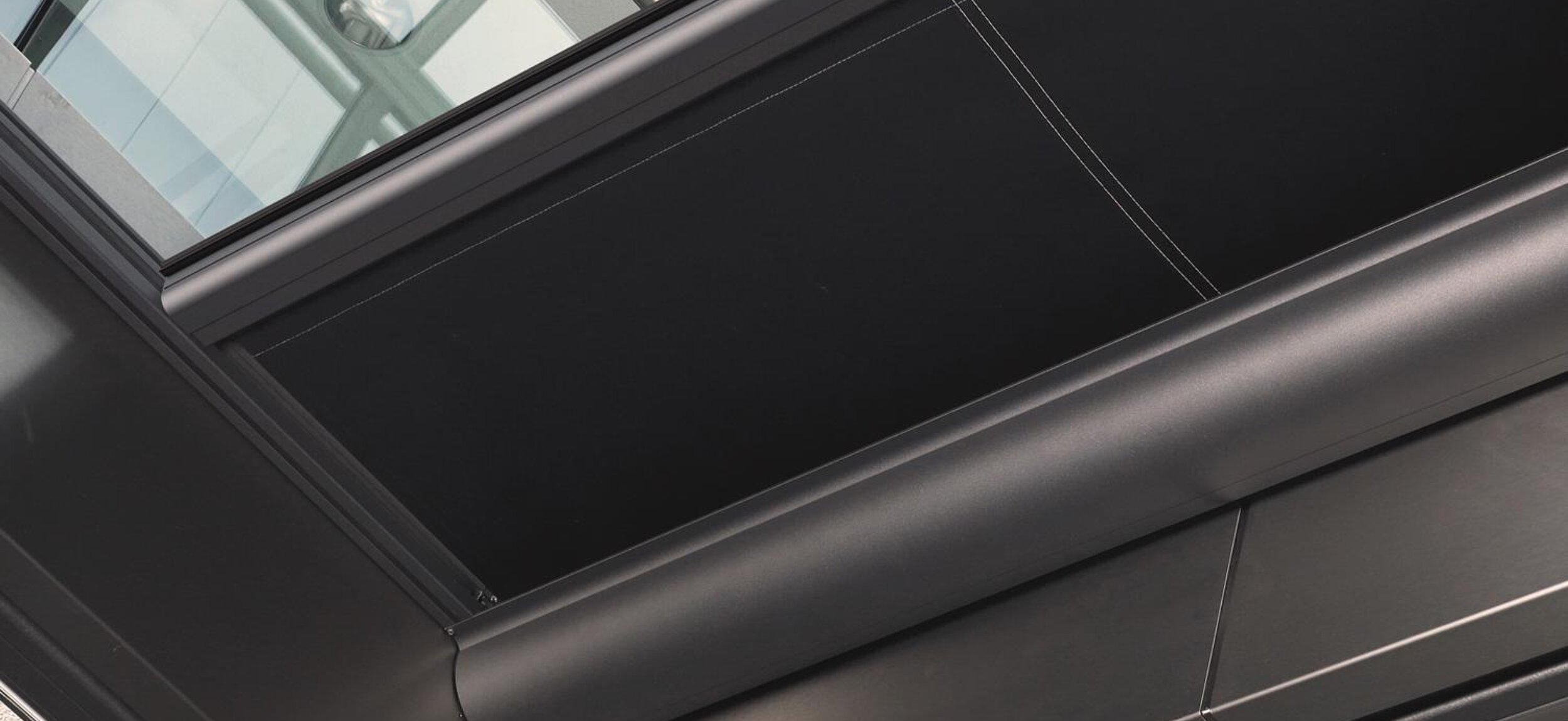 - Innen- bzw. unter Glas liegender, flexibler Sonnenschutz im modernen Design