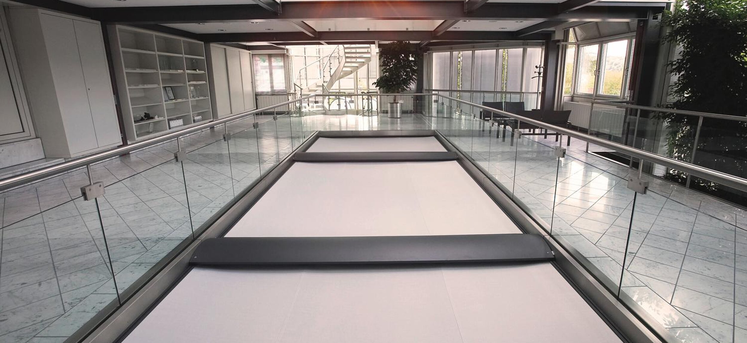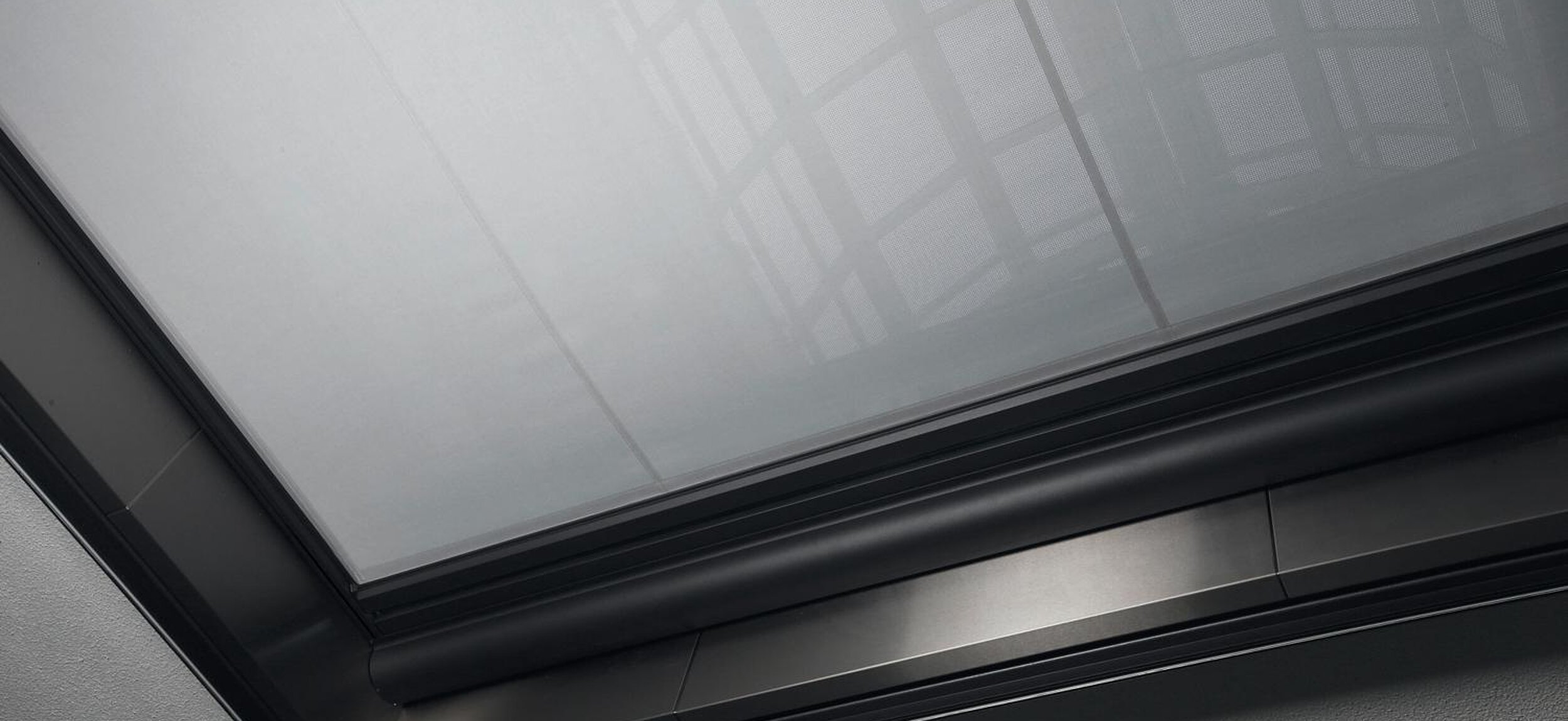- Innen- bzw. unter Glas liegender, flexibler Sonnenschutz im modernen Design
