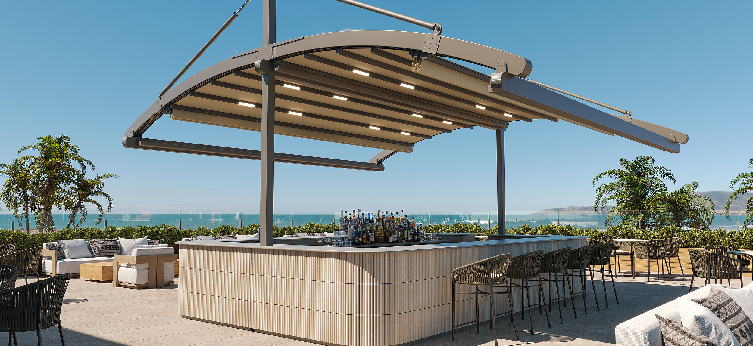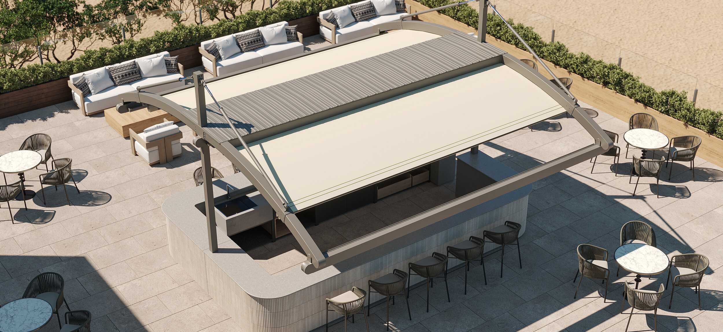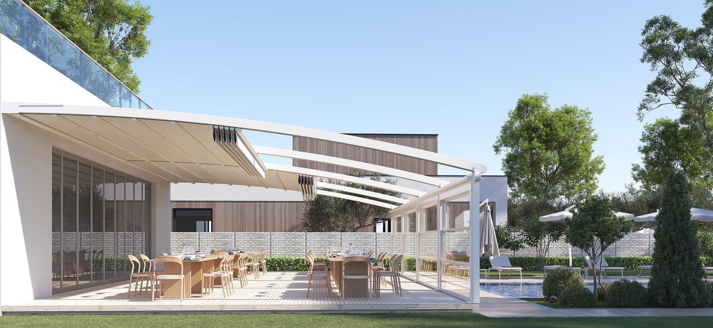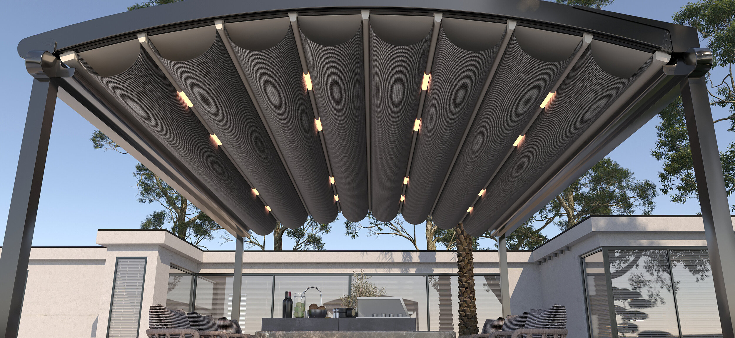 Ein elegantes und modern gestaltetes Pergolasystem aus Aluminium mit ovaler Dachabdeckung und integriertem Dachrinnensystem.