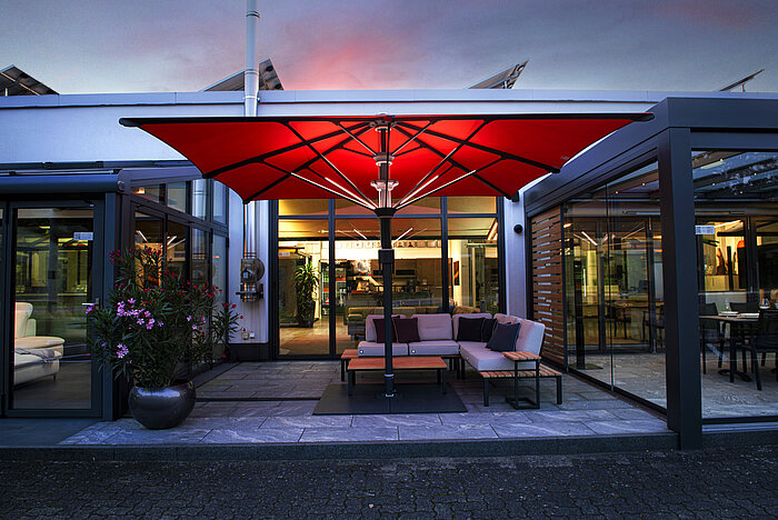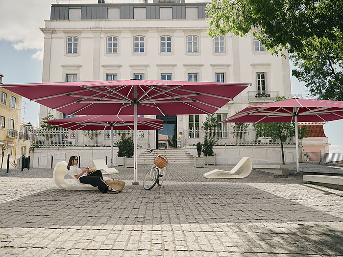 Jumbrella XL steht für »extra large« – extra groß. Die überspannte Fläche reicht von 25 m2 bis 49 m2. Der Jumbrella XL trotzt den höchsten Windbelastungen und zeichnet sich durch eine Vielzahl an Kombinationsmöglichkeiten und Besonderheiten seiner Zusatzausstattung aus. Die Ausführungen lassen sich individuell je nach technischen Anforderungen kombinieren.