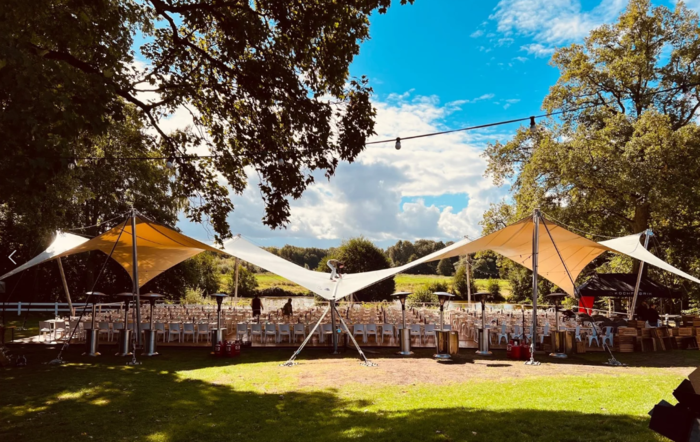 Das Doppel-Sonnensegel Papillon ist unser größtes Zelt und der große Bruder vom Pegasus. Unter einem Zeltdach können bequem bis zu 300 Gäste bestuhlt Platz nehmen.
