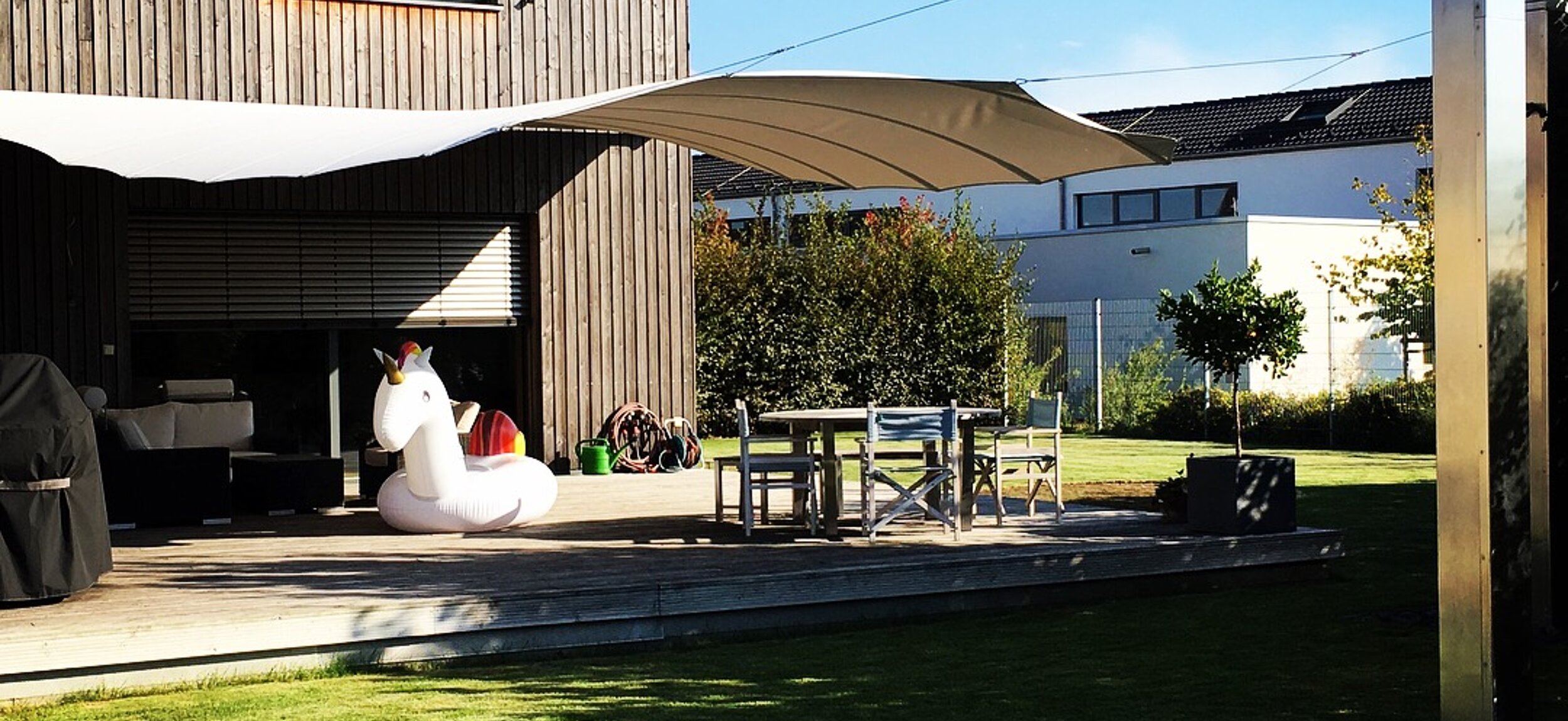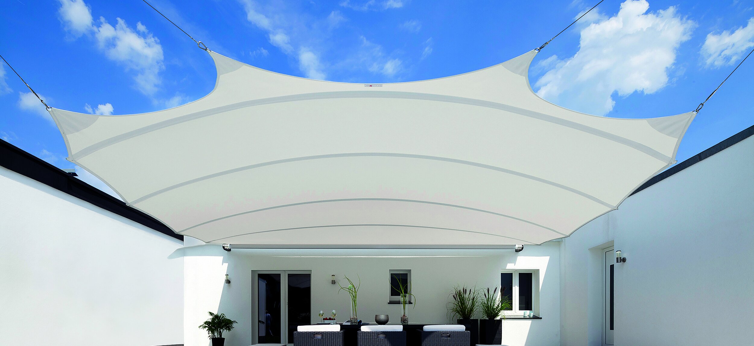 Bei diesem Segel stehen die Masten vor dem Kopf der Segelfläche. Vier Zugseile und die daraus entstehenden Zuglinien lassen die konvexe Form des Segels maximal wirken und ergeben eine Überdachung mit noch höhere Windstabilität.