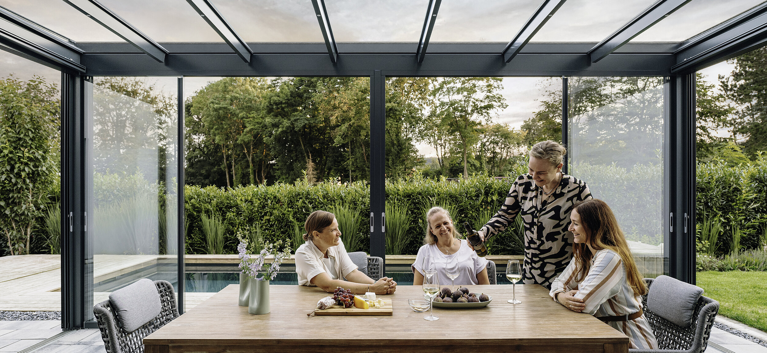 - Für das System ist sowohl eine Unterglasmarkise als auch senkrechte Beschattung optional erhältlich
