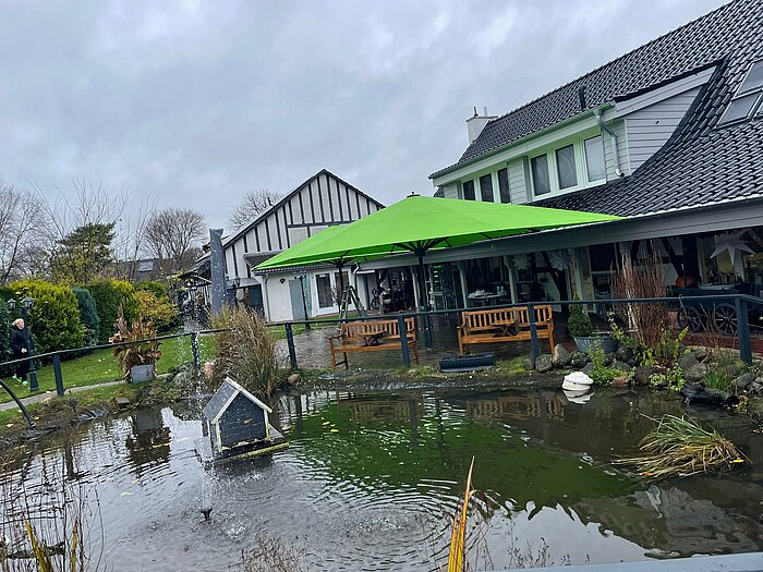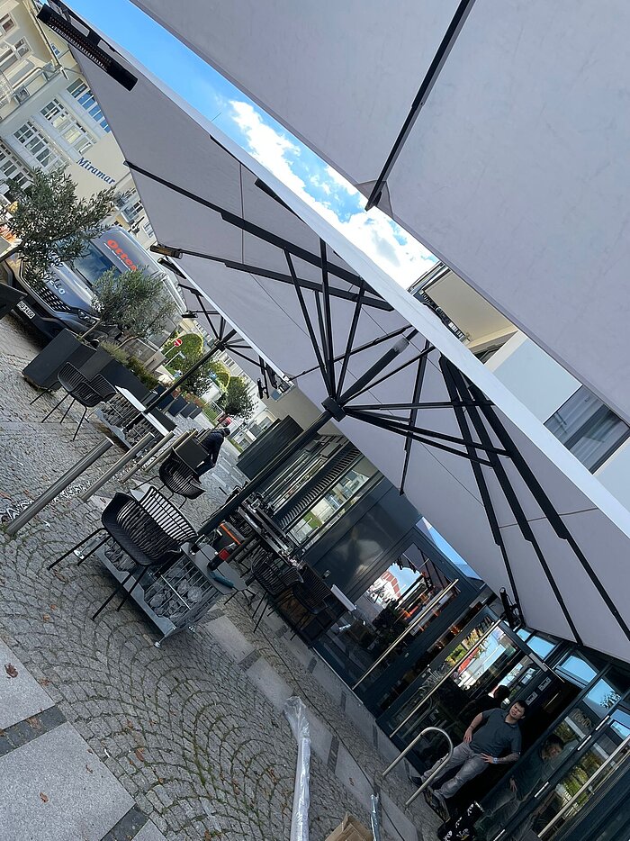 Für das Restaurant im Hotel Strandleben in Schleswig durften wir eine hochwertige Beschattungslösung realisieren. Zum Einsatz kamen mehrere MAY „Albatros“ Sonnenschirme im großzügigen Format 5 × 5 m, ausgeführt in robuster 12-Teiler-Konstruktion – ideal für den anspruchsvollen Einsatz in Gastronomie und Hotellerie.