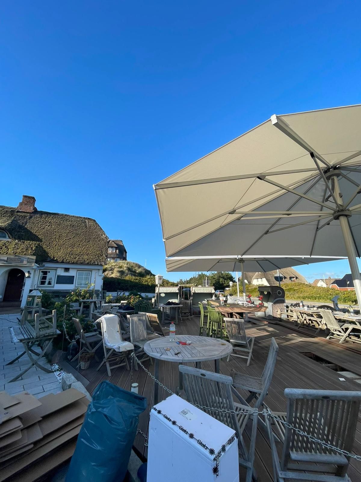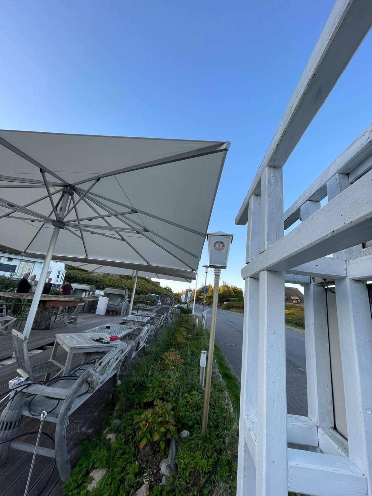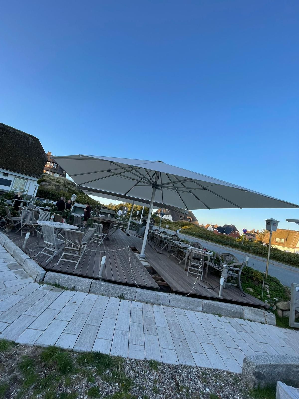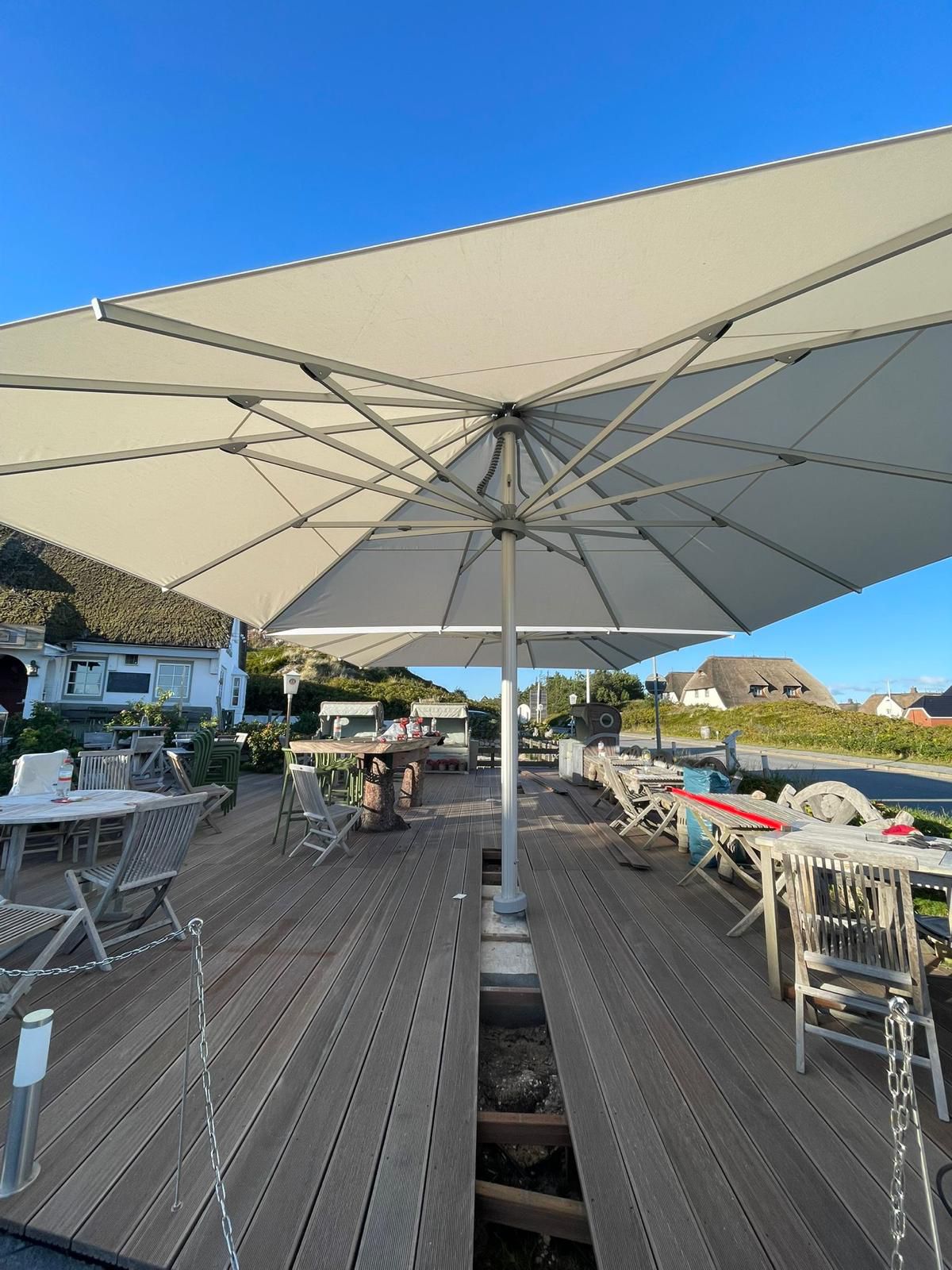 Für dieses anspruchsvolle Projekt wurden zwei GLATZ Palazzo Royal Sonnenschirme in Sondergröße installiert. Die asymmetrischen Schirme mit den beeindruckenden Maßen 700 × 665 cm bieten großzügige Schattenflächen und vereinen elegantes Design mit höchster Stabilität und Funktionalität.