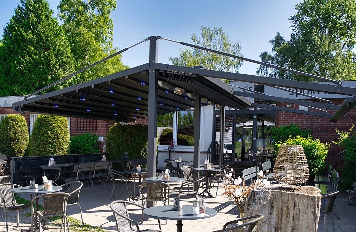 Die Farbkombination aus der klaren Pergola-Struktur und dem FS Flexy 3D Tuch in Grün (1483) verleiht der Anlage eine exklusive, naturverbundene Atmosphäre. Damit wird die Pergola zum architektonischen Highlight, das funktionale Vorteile mit anspruchsvollem Design verbindet.